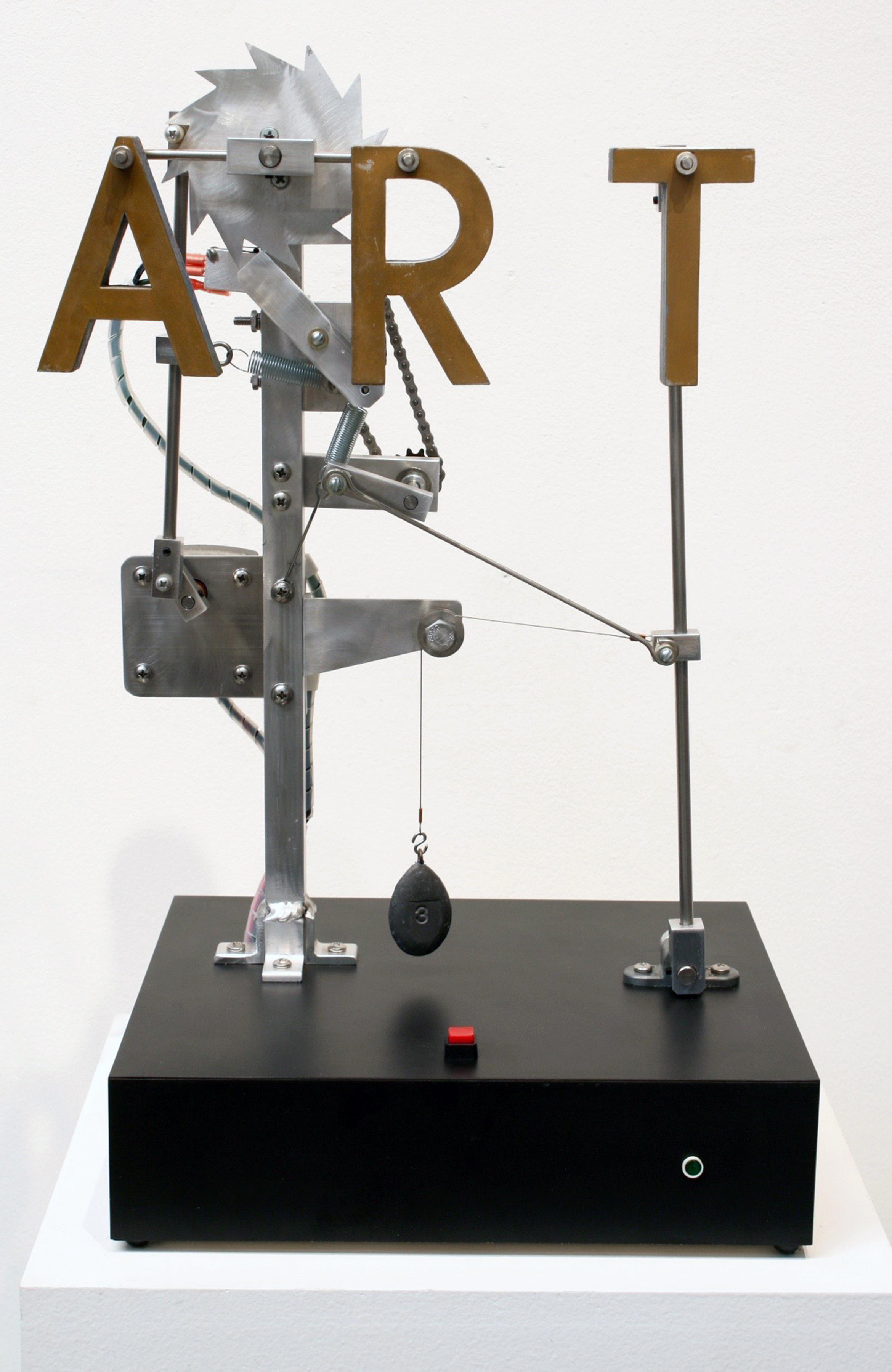 The Escalation of Effect” incorporates the use of both “direct” and “indirect” movements. The bottom chair is directly set into motion by the motor while the other two chairs above, supported by balance and counterweights, are simply reacting to the bottom chair. The result is a playful and unpredictable movement. This piece is made of poplar, lead, aluminum and steel and measures 81”H x 23” W x 15”D